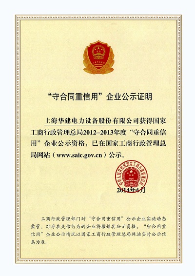“守合同重信用”企业证书 发布时间: 2017-06-13 14:02:42 发布网站: 中国电力建设招标网